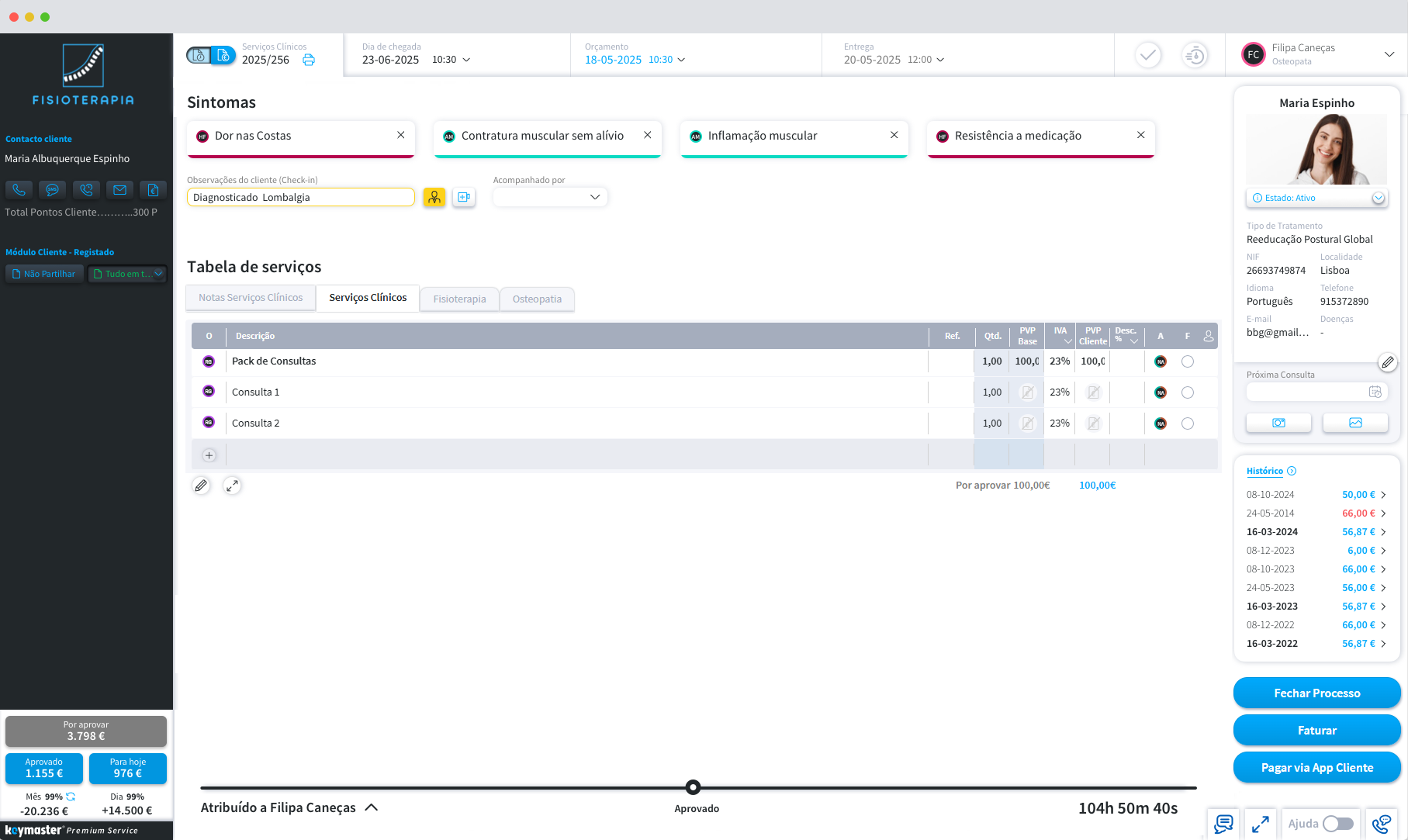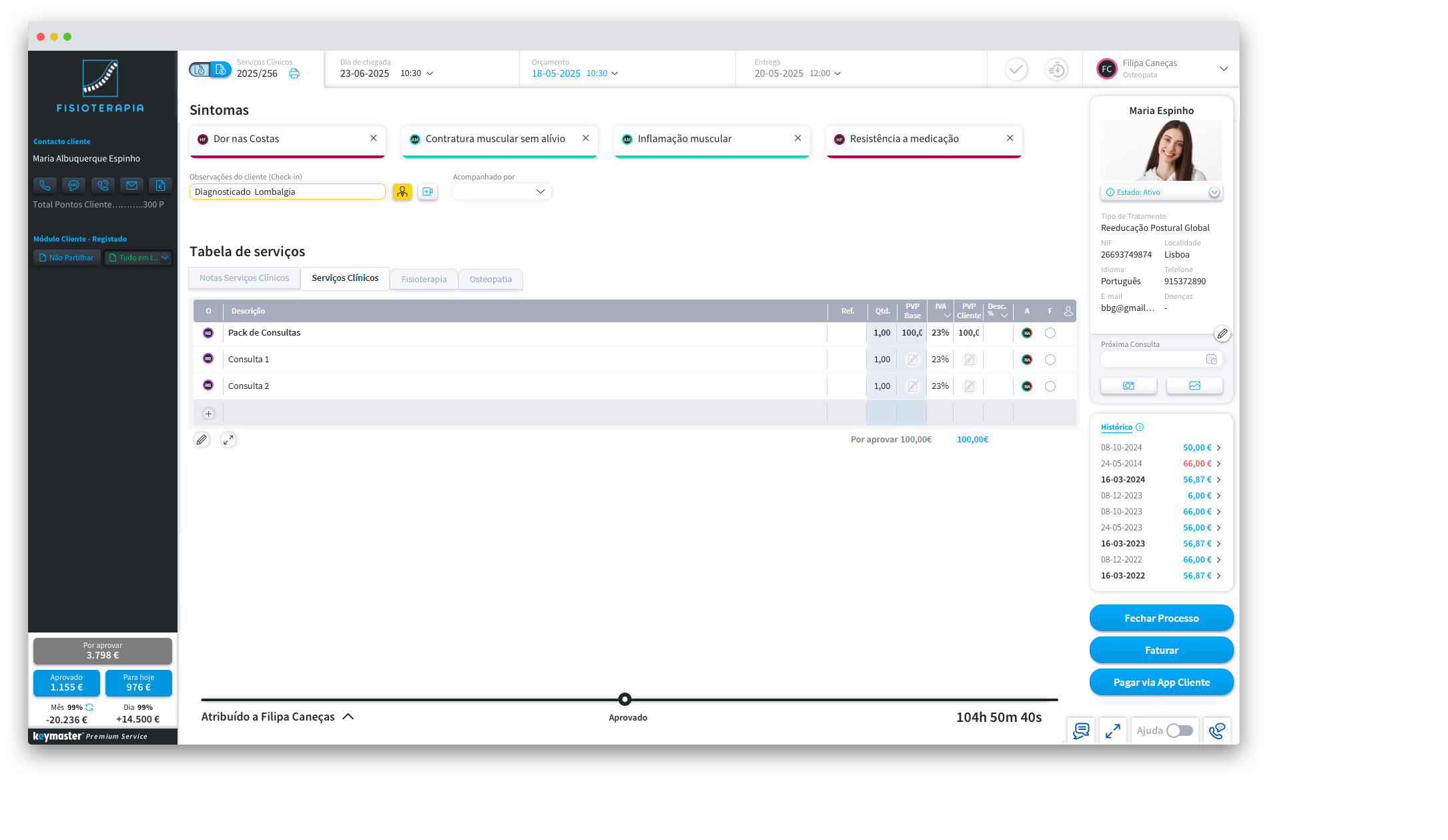 Comtempla todo o CRM Keymaster incluindo, Galeria de fotos, vídeos, exames e ficheiros, Lembretes/Confirmações de marcações, Chat interno assim como Chat com Cliente, hipótese de gerar videochamadas e muito mais.