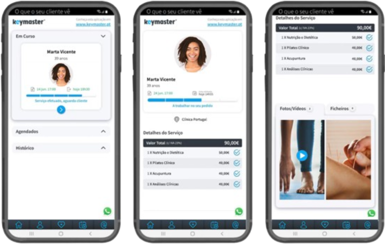 Comtempla todo o CRM Keymaster incluindo, Galeria de fotos, vídeos, exames e ficheiros, Lembretes/Confirmações de marcações, Chat interno assim como Chat com Cliente, hipótese de gerar videochamadas e muito mais.